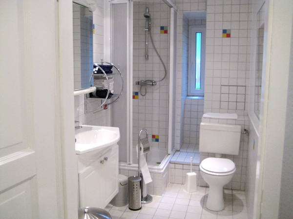 Das geflieste Duschbad ist mit WC, Waschbecken und einem Föhn ausgestattet. Alle Böden der Wohnung sind gefliest.