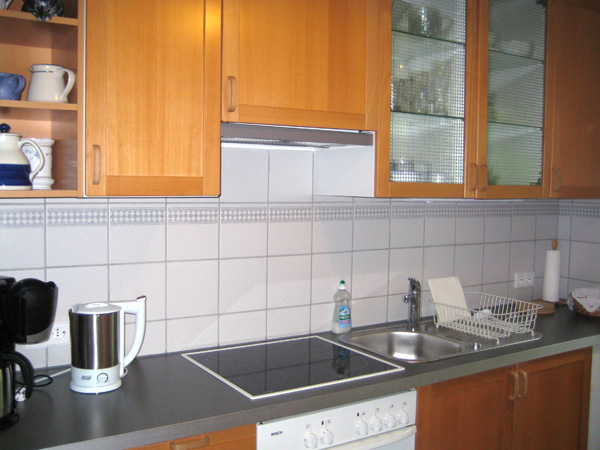 Die Wohnküche ist voll ausgestattet mit Kaffeemaschine, Wasserkocher, Mikrowelle, Toaster und einem Elektroherd mit Backofen.
